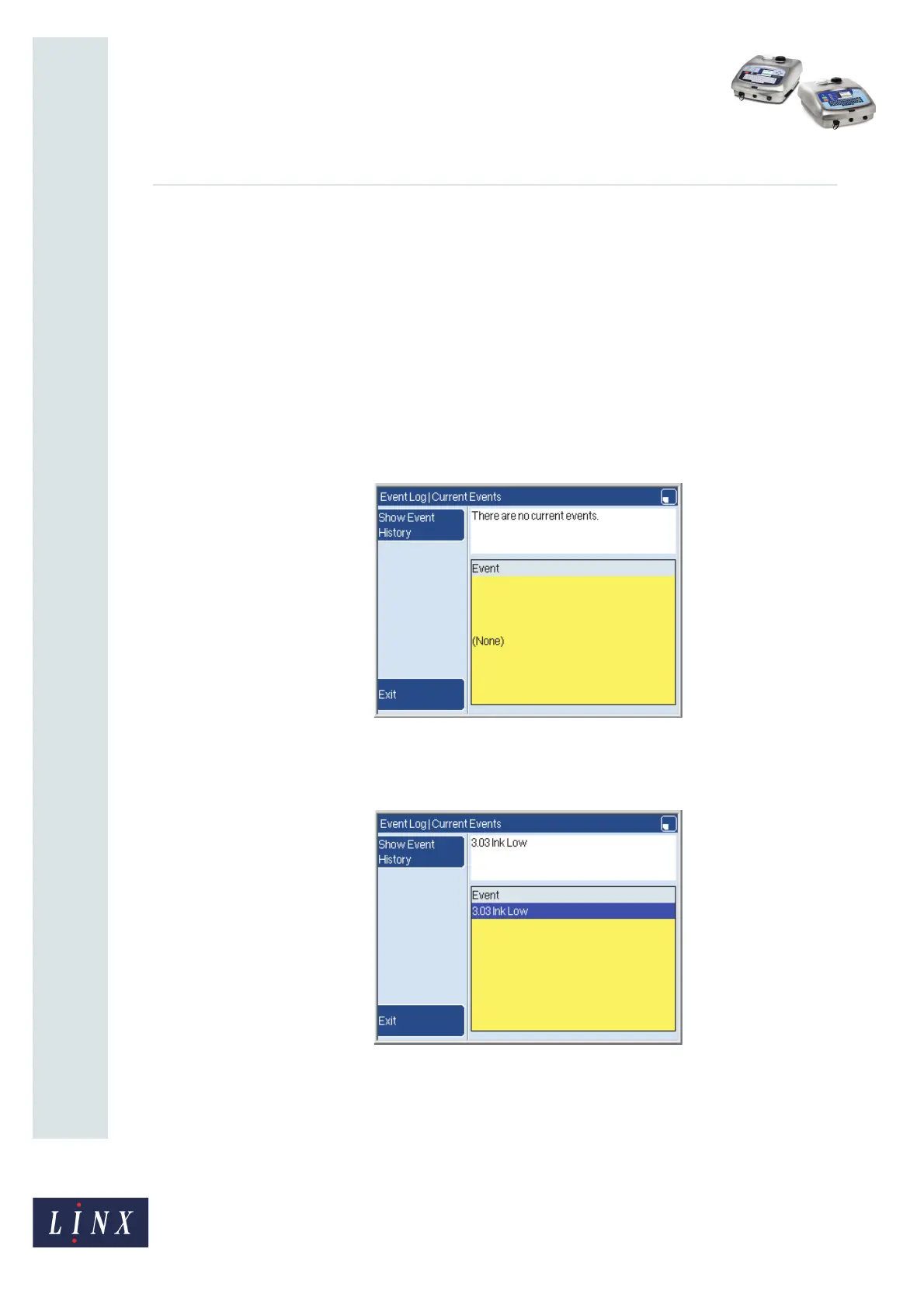 If there is an active event (for example “3.03 Ink Low”), the event is displayed in the