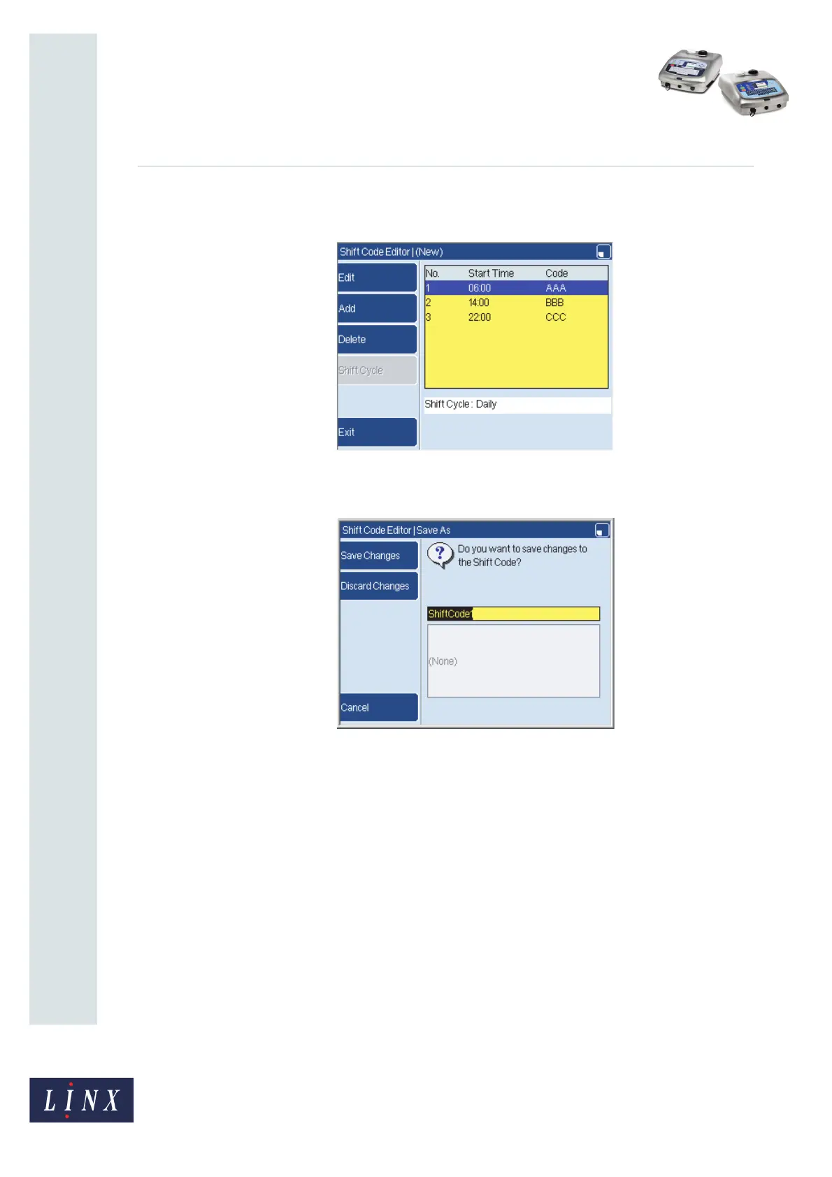10 To save the shift code, press the Exit key. The printer displays the Save As page.