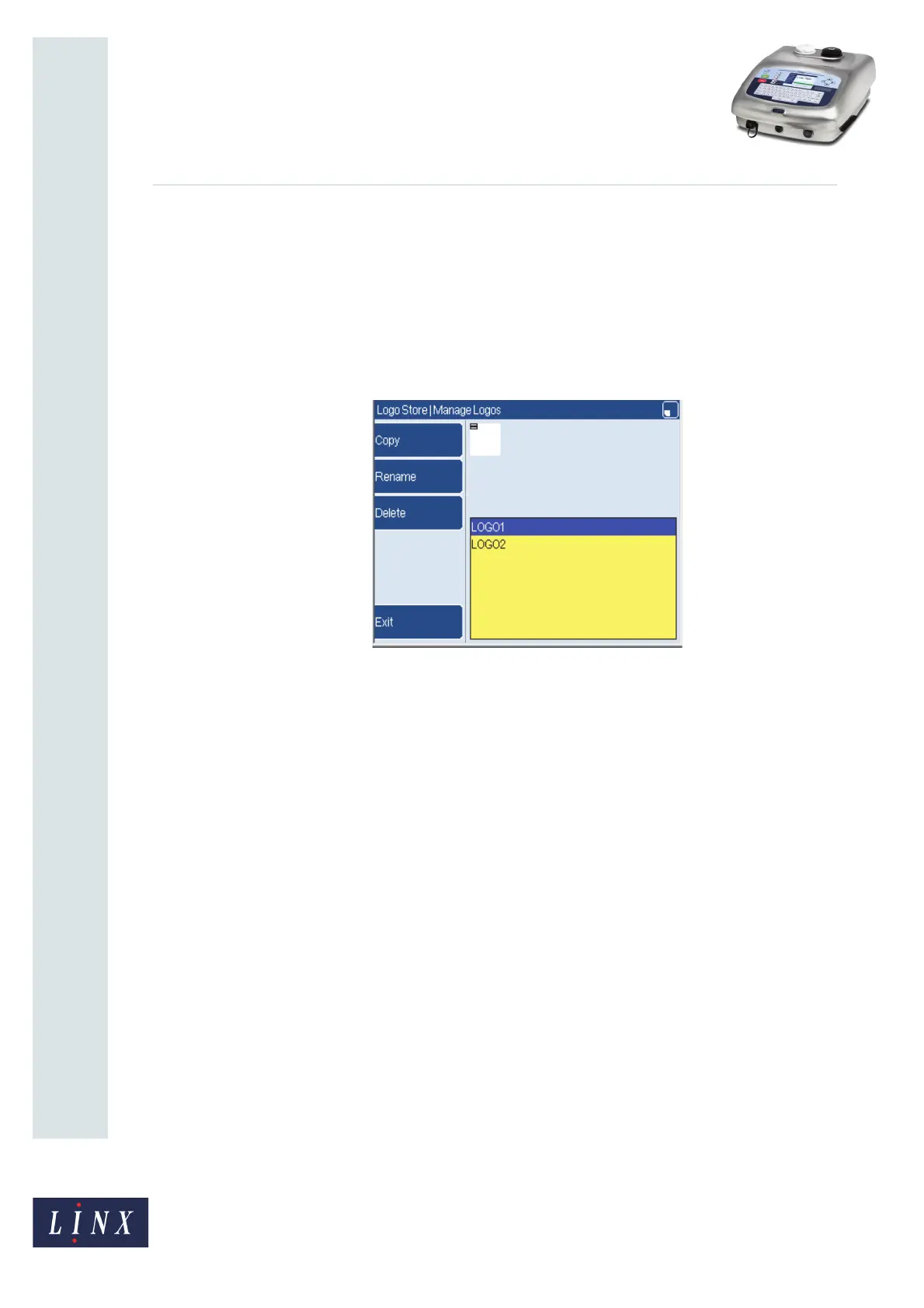 At the Logo Store page (see Figure 2 on page 3), press the Manage Logos key to display the