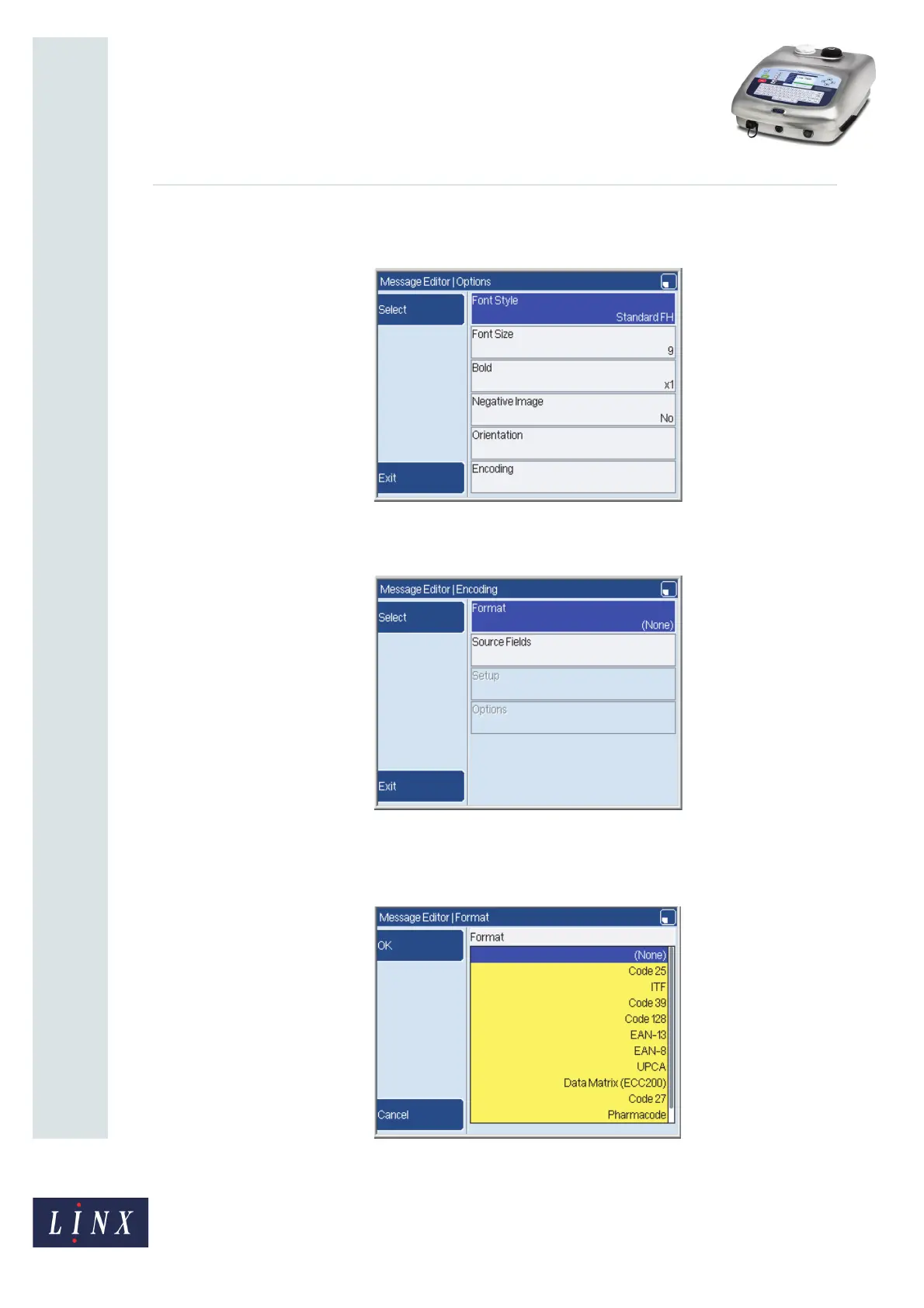 3 Select the Format option. The printer displays a list of bar the code formats that are