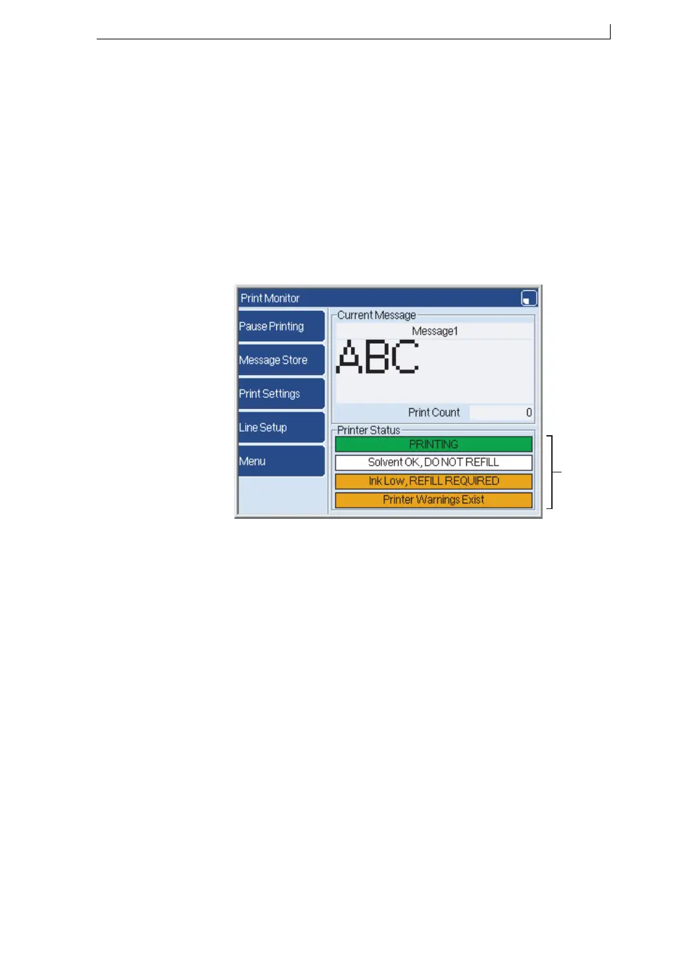 sure that there are no problems. The Printer Status area (labelled “A” in