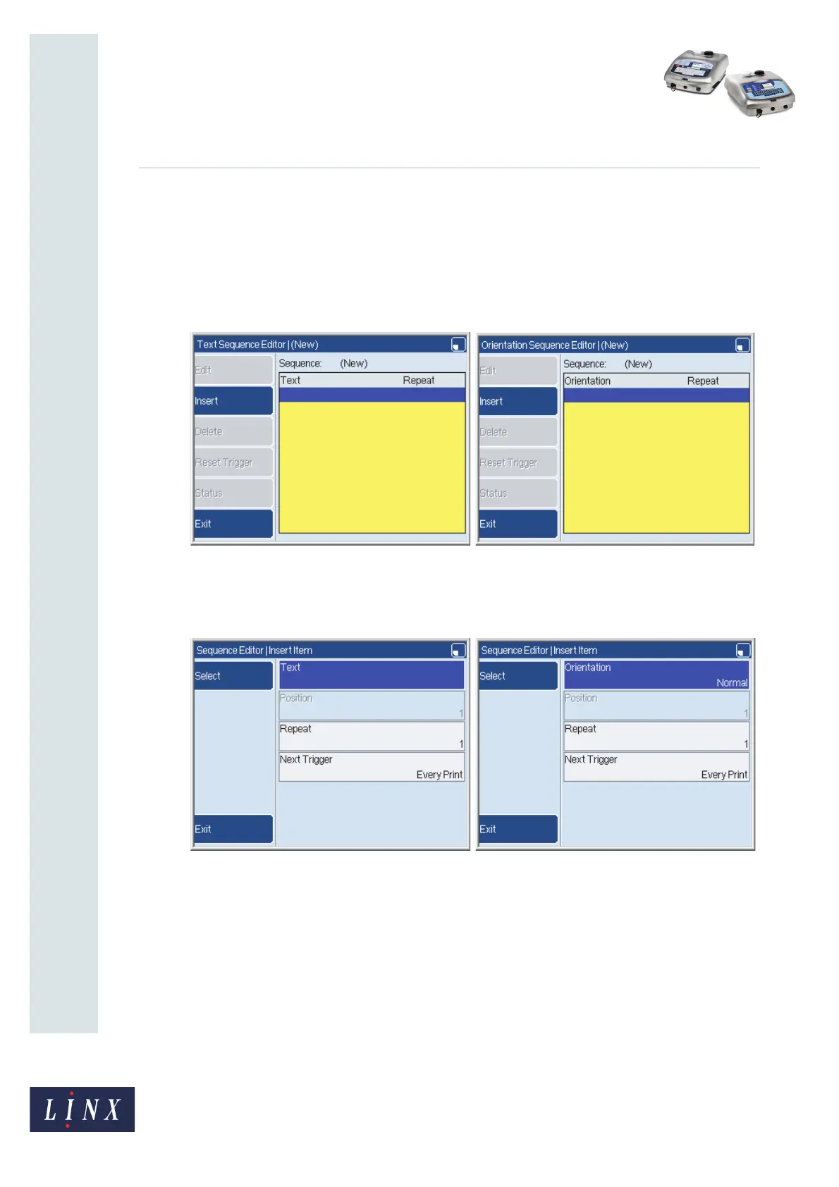 1 Press the New key to begin. The printer displays the Text Sequence Editor page or
