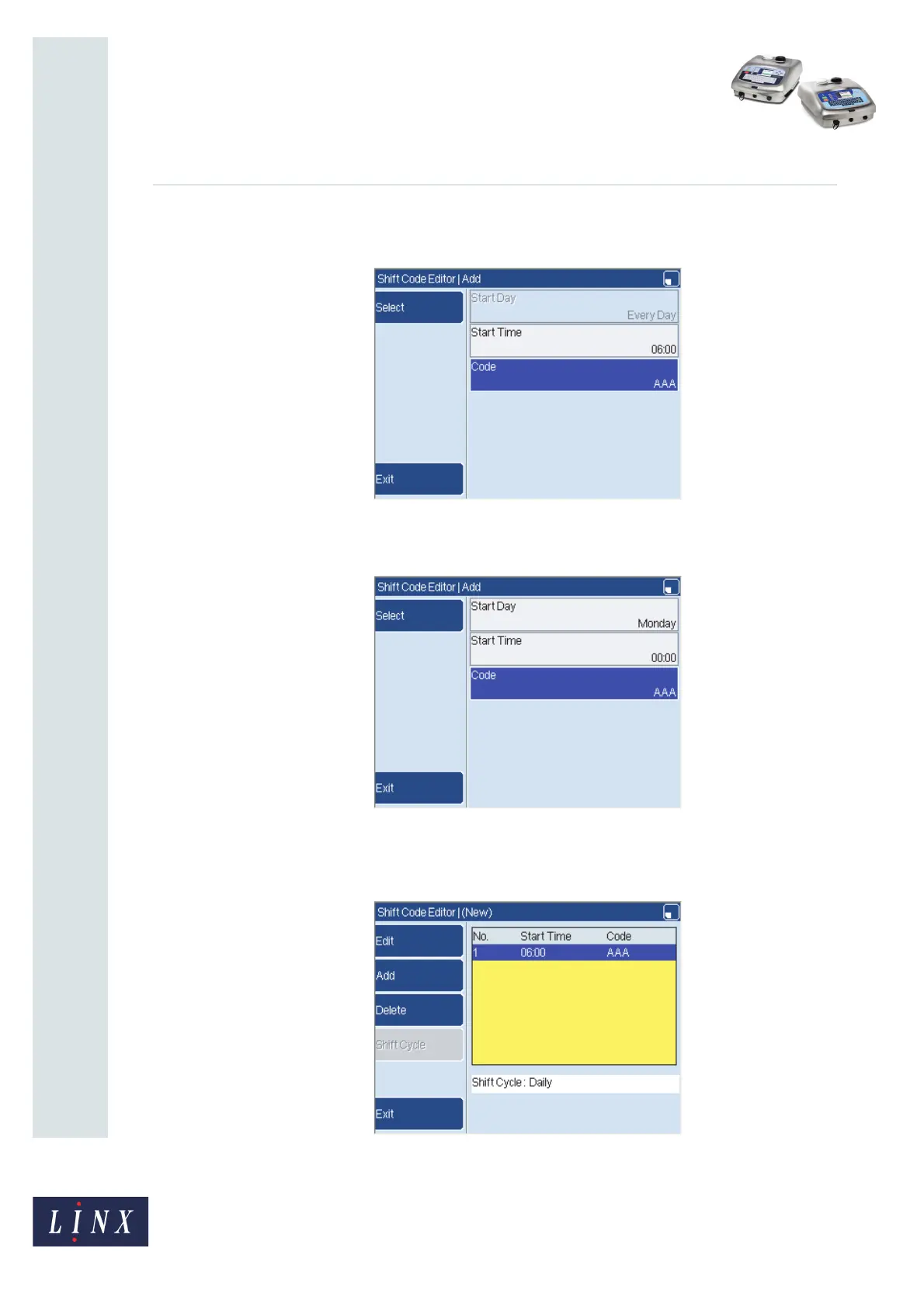 8 Press the Exit key to return to the Shift Code Editor page. The page shows the first