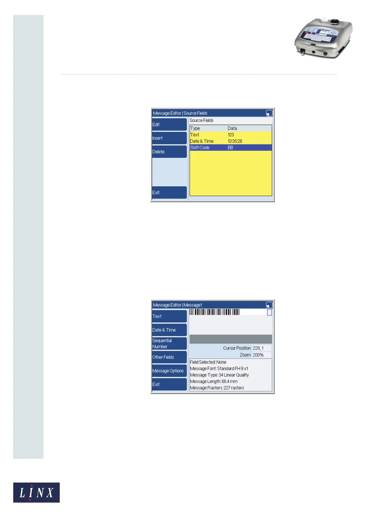 Message Editor page. The printer displays the completed bar code.