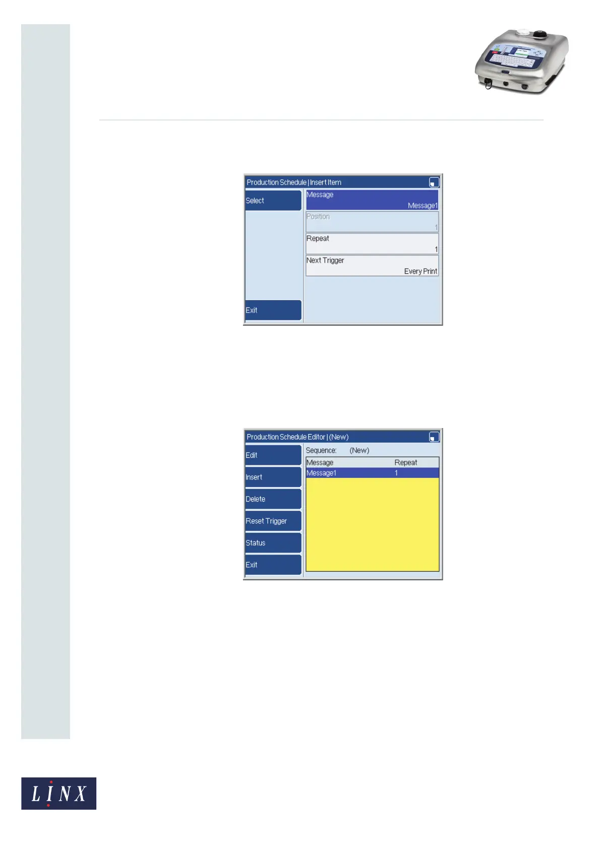 7 Press the Exit key to return to the Production Schedule Editor page. This page