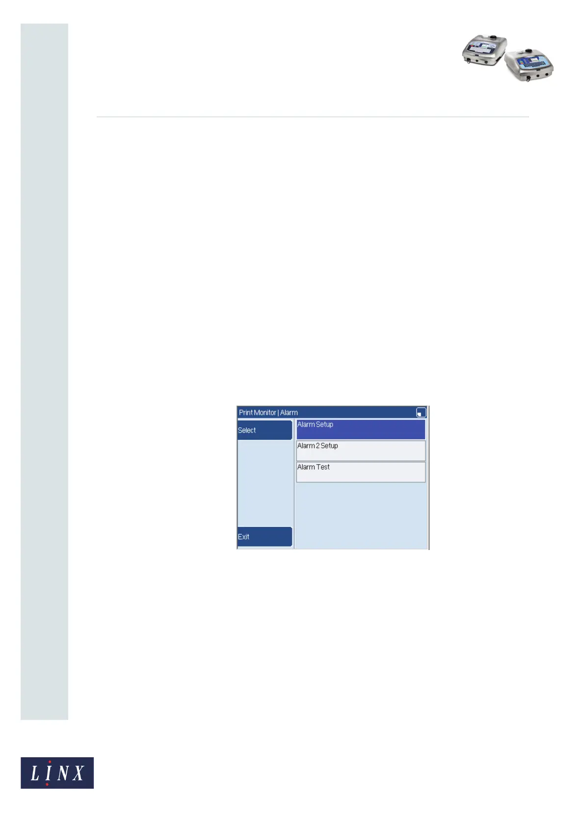 At the Print Monitor page, select Line Setup > Alarm to display the Alarm page.