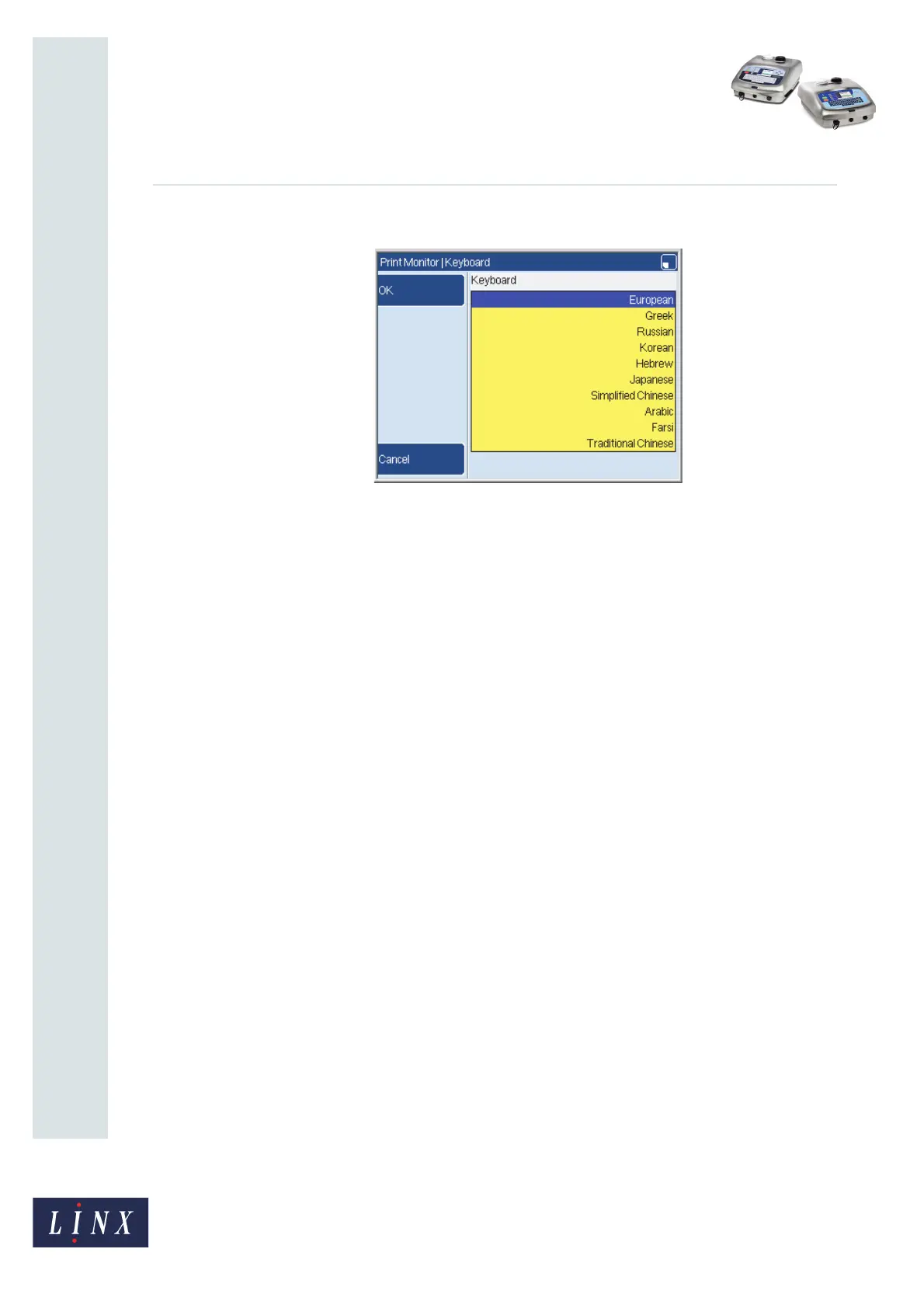 If you select the Keyboard option the printer displays a list of keyboard types (countries).