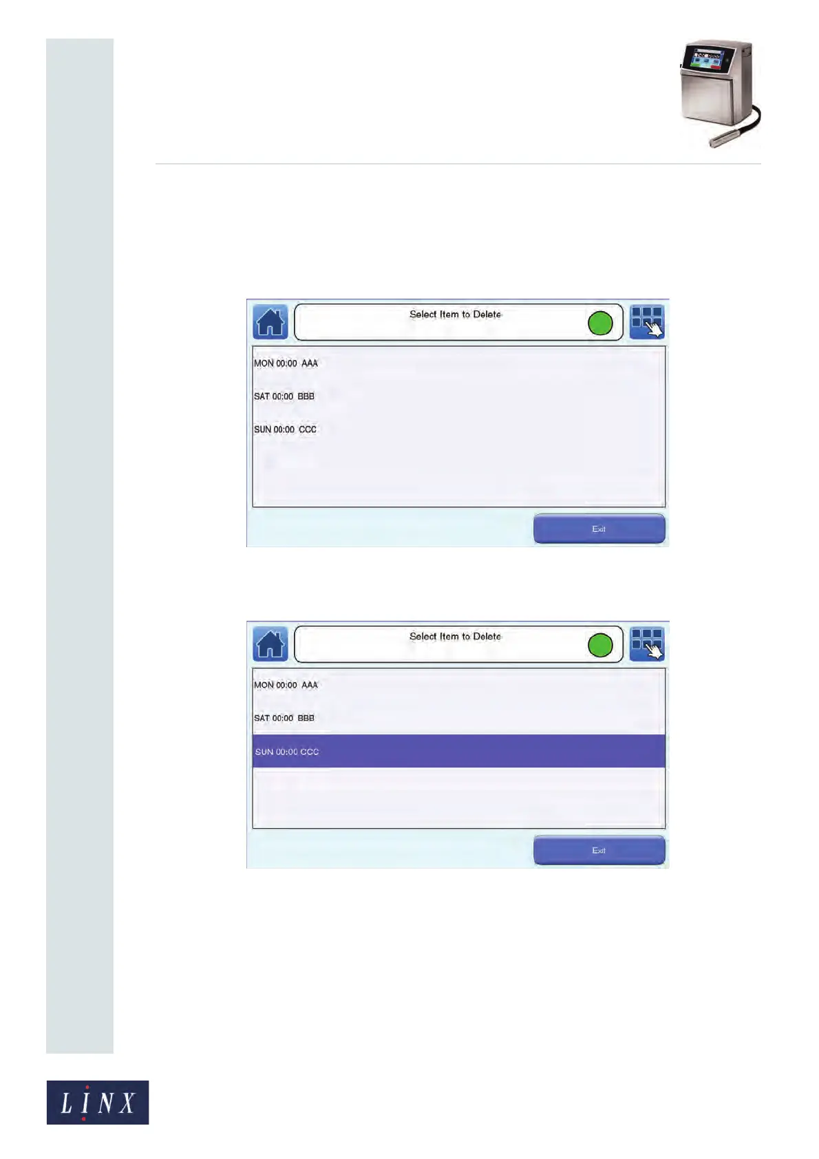 3 Touch the Delete button. The selected shift code item is deleted.