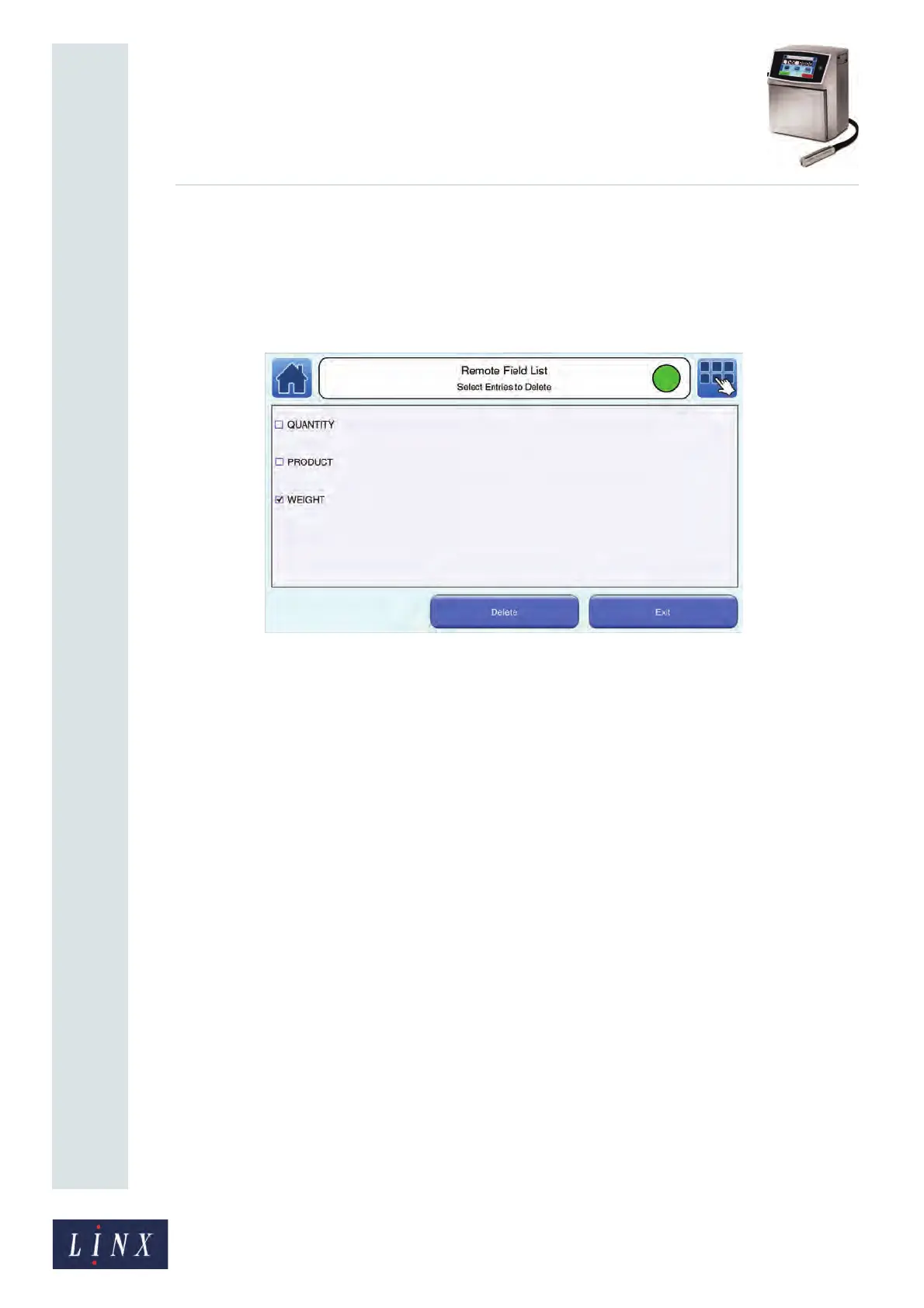 9 Select the fields you wish to delete, and then touch the Delete button. The printer