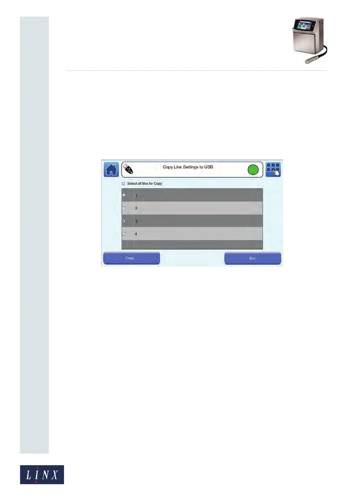 2 Touch the Copy Line Settings to USB button to display the Copy Line Settings to