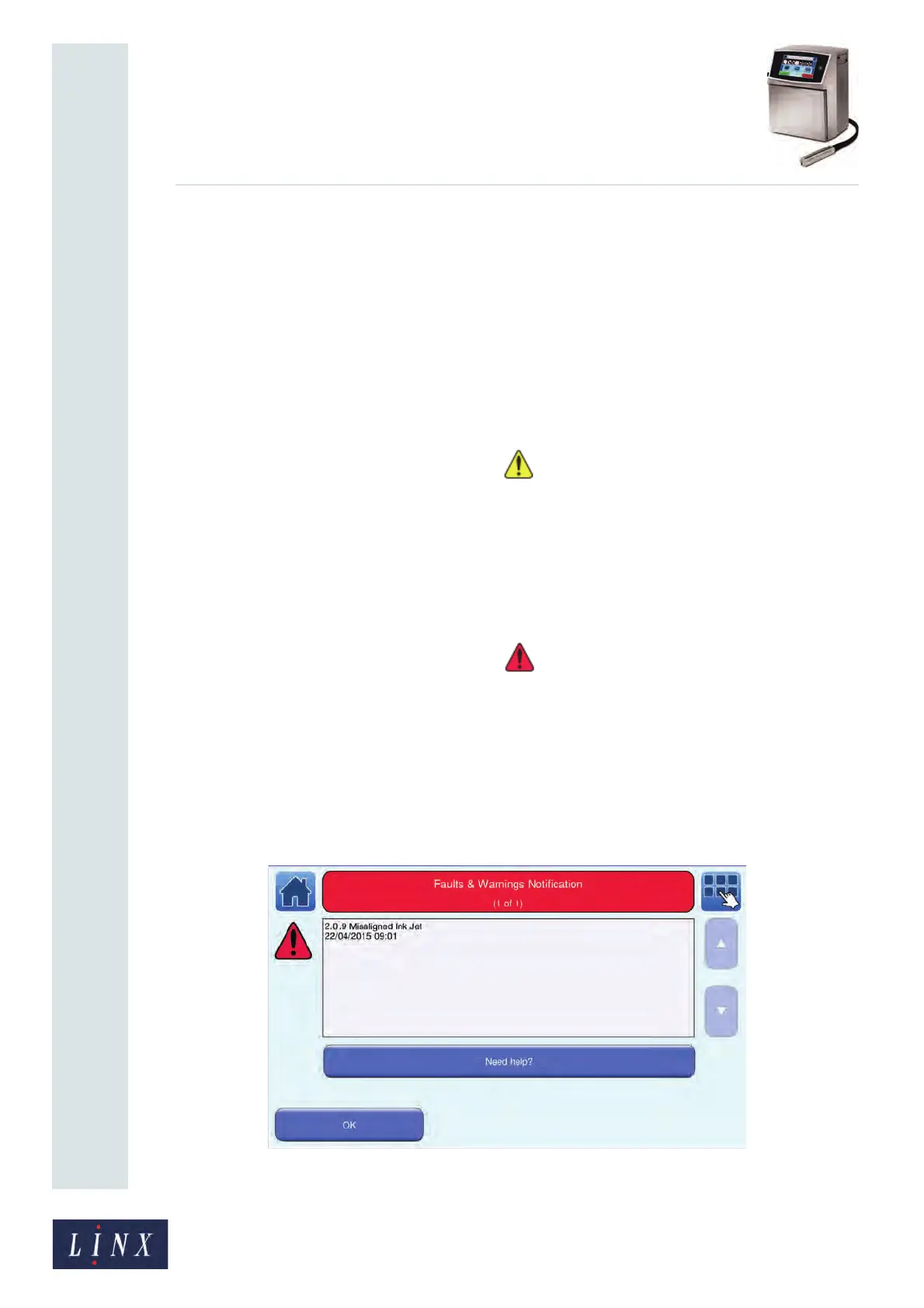 When a Fault or Warning occurs, the printer displays a notification screen that shows
