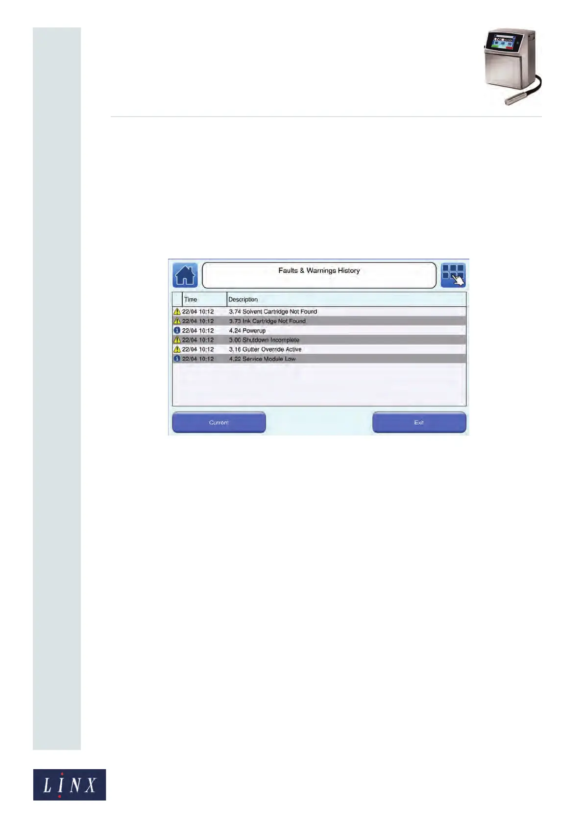 10.6 Faults & Warnings History screen