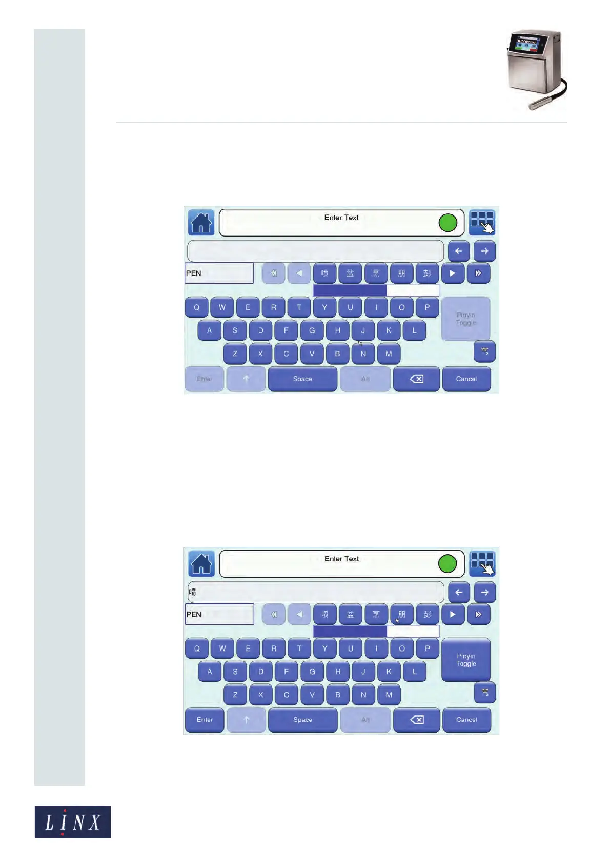 2 The Enter Text screen opens in ‘Pinyin’ mode (see Figure 25 on page 28). This