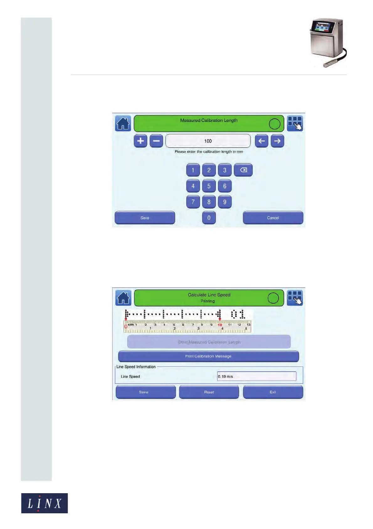 button. The printer calculates the line speed from the entered measurement and