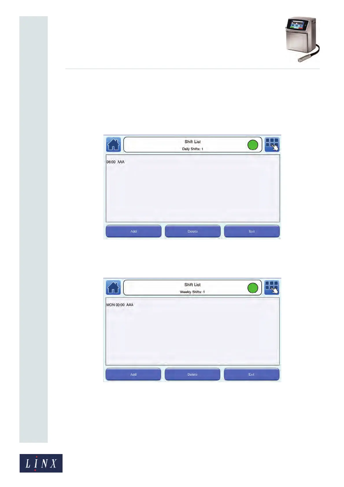 11 Touch the Exit button to display the Shift List screen. The Shift List screen shows