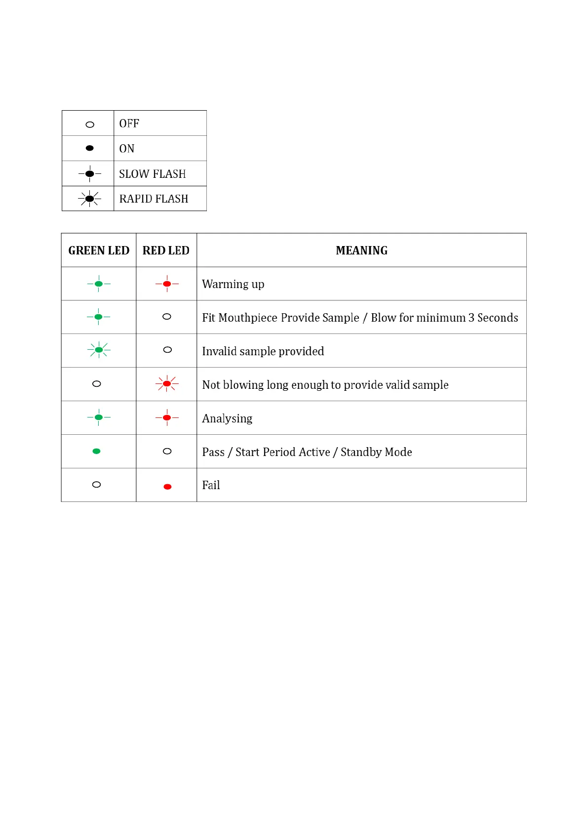 The following table shows the display message on the screen and the equivalent LED sequence of green
