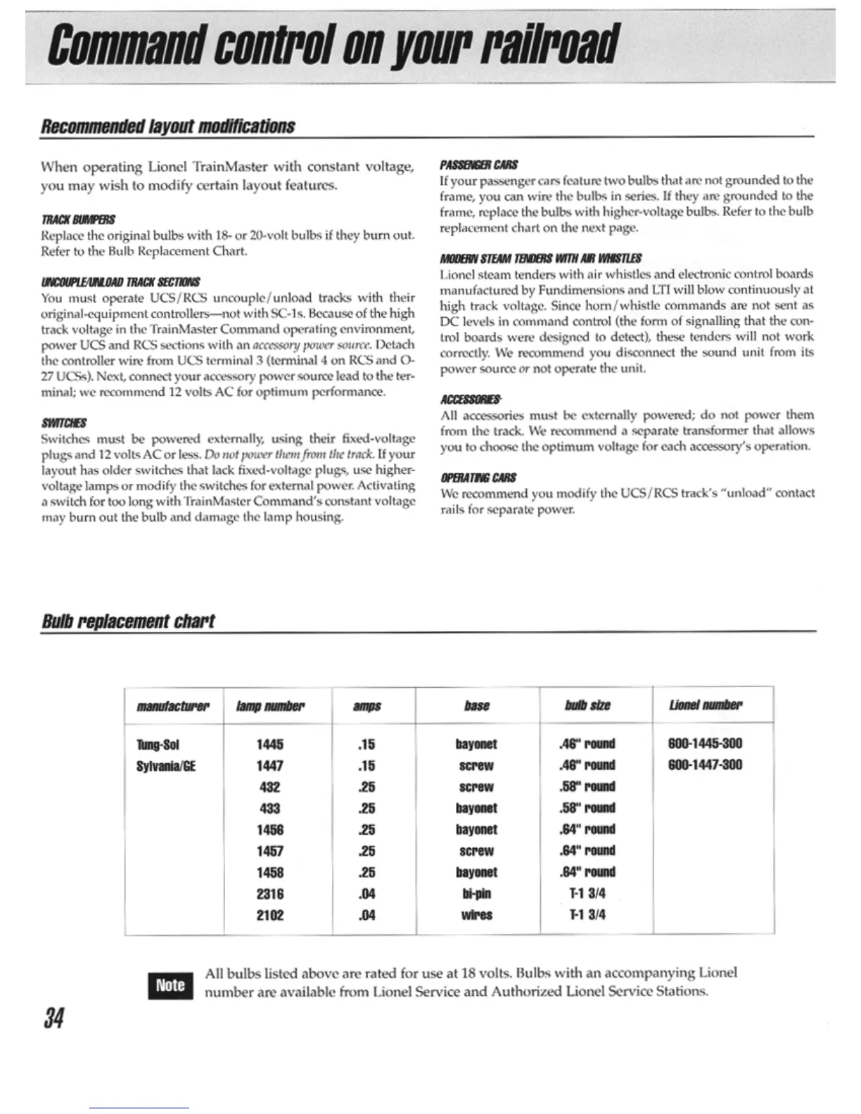 Lionel Trainmaster Command - Recommended Layout Modifications; Bulb Replacement Chart