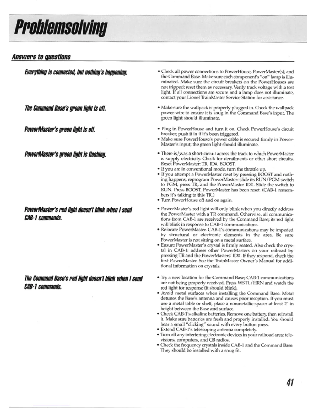 Lionel Trainmaster Command - Problemsolving; Answers to questions