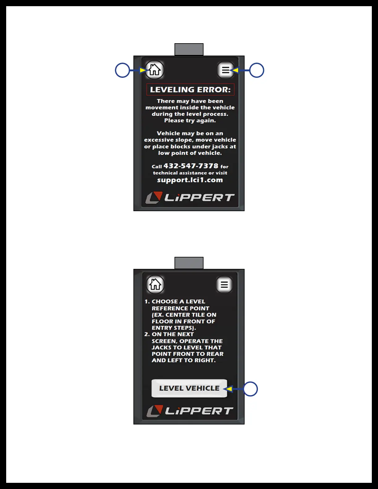 NOTE: Do NOT move inside coach while the system is trying to level. A leveling error code screen