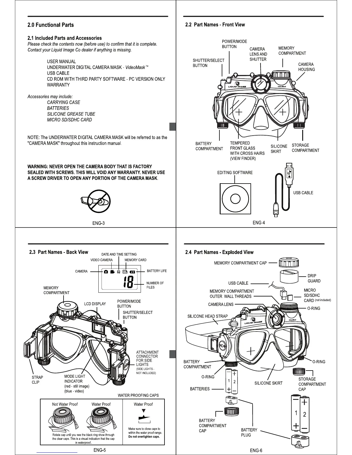 Liquid Image VideoMask UDM 310 - 2.0 Functional Parts; 2.1 Included Parts and Accessories; 2.2 Part Names - Front View; 2.3 Part Names - Back View