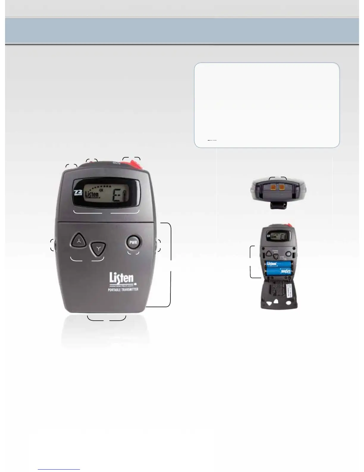 • Look&Listen™ LCD shows channel, battery status,