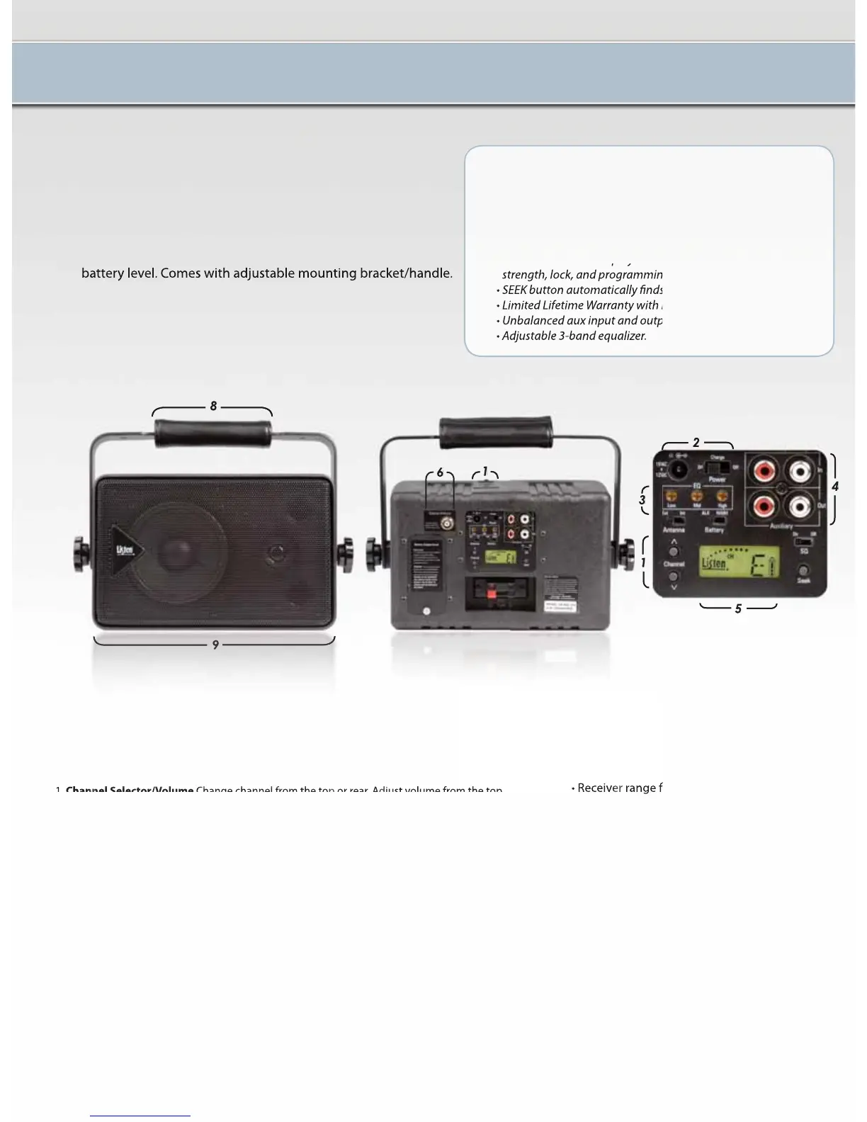 1. Channel Selector/Volume Change channel from the top or rear. Adjust volume from the top.