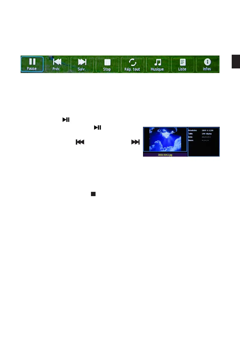 • Utilisez la touche (pause) pour ger la photo sur l’écran. Pour redémarrer le diaporama,
