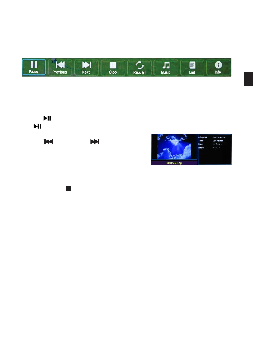 • Press the ENTER button to enter the menu bar (play, repeat, list, info, rotate, zoom, move).