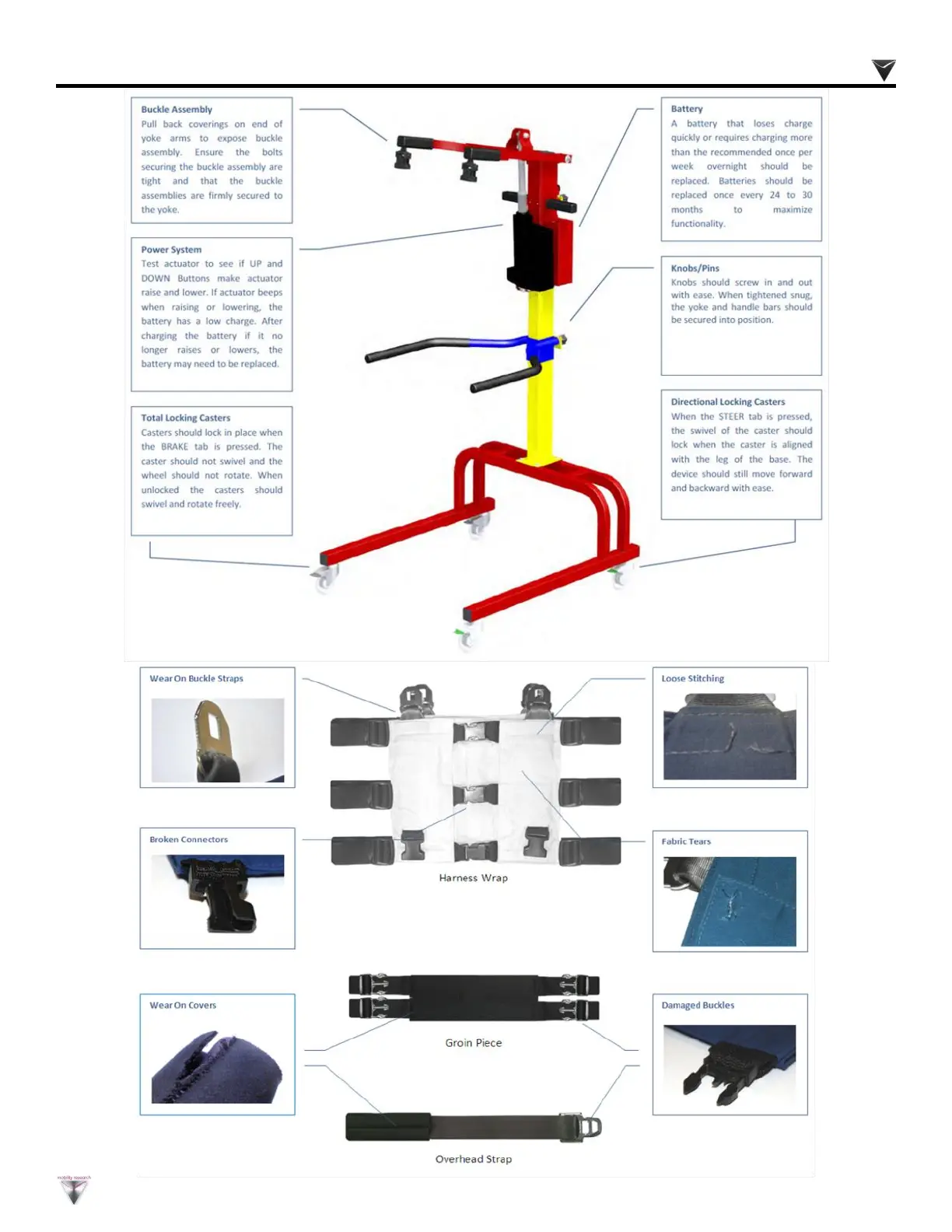 LiteGait Walkable - Buckle Assembly Checks; Battery Replacement Guidance; Power System Checks; Knobs and Pins Check