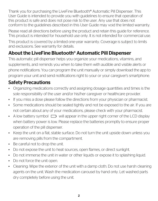 Thank you for purchasing the LiveFine Bluetooth® Automatic Pill Dispenser. This