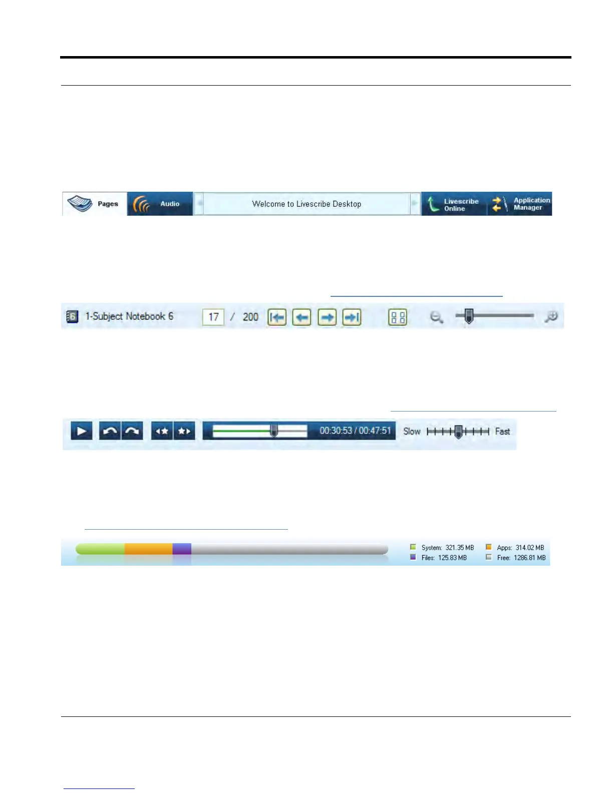 Audio Controls are located at the bottom of the Livescribe™ Desktop screen. This toolbar is for