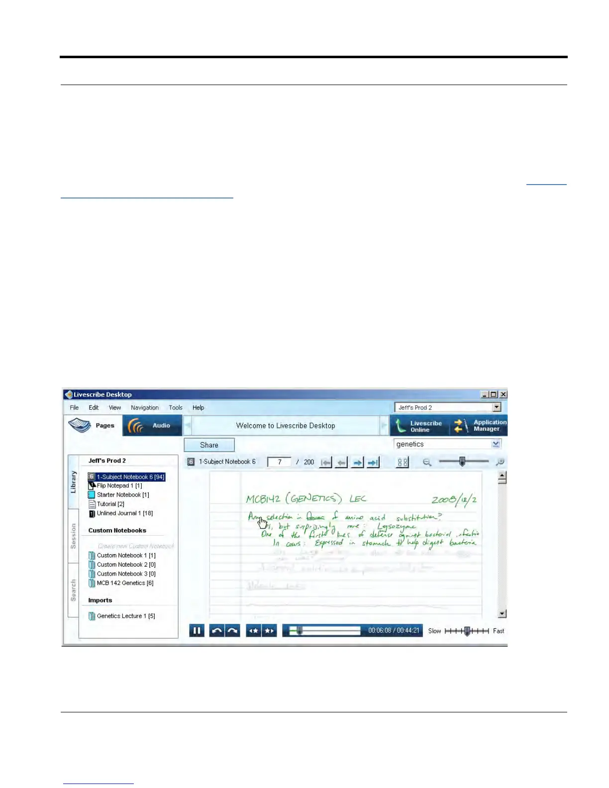 session's audio. Livescribe™ Desktop display the current session's notes in gray ink as the audio