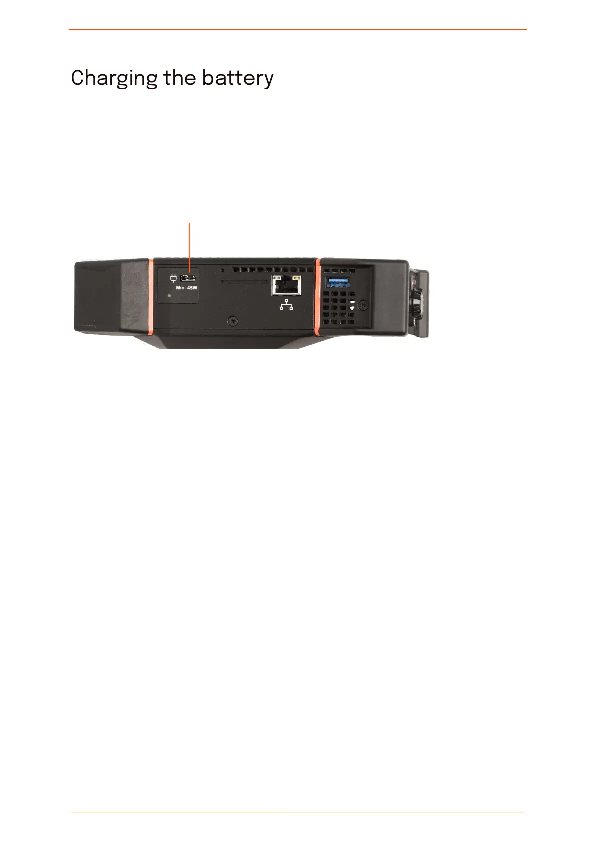 To charge the battery, plug the AC/DC power adapter into the Min. 45W power connector on