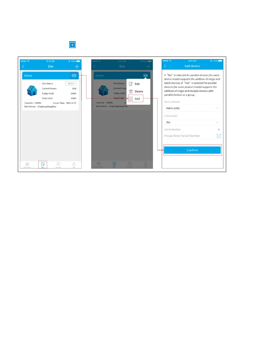 •Touch "Add" button [ ] at the top right of the PV site page to add a device.