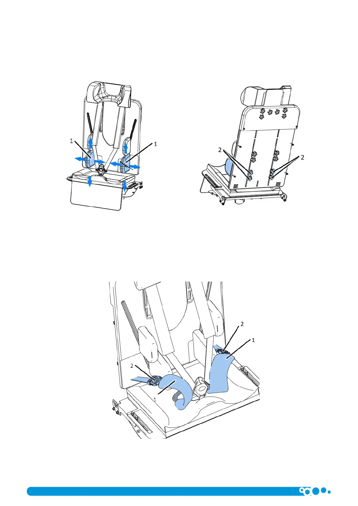The hip supports (1) ensure correct position and stabilisation of the child’s pelvis and hips. The supports can also be used to