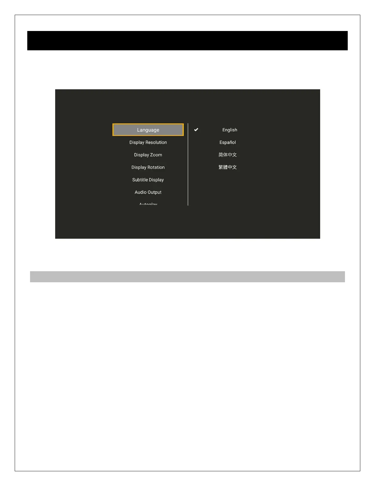 Available settings: English, Spanish, Simplified Chinese, Traditional Chinese.
