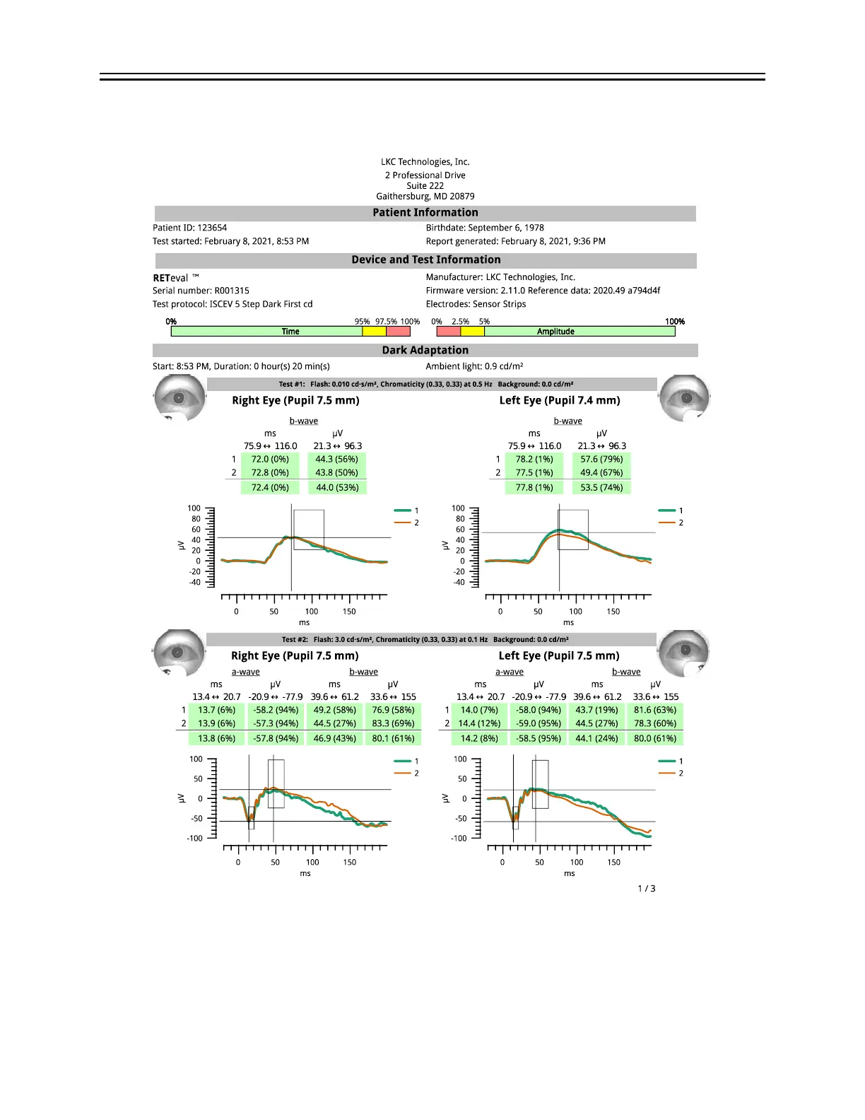 An example PDF report for the ISCEV 5 step, dark adapted first, cd protocol is shown below.