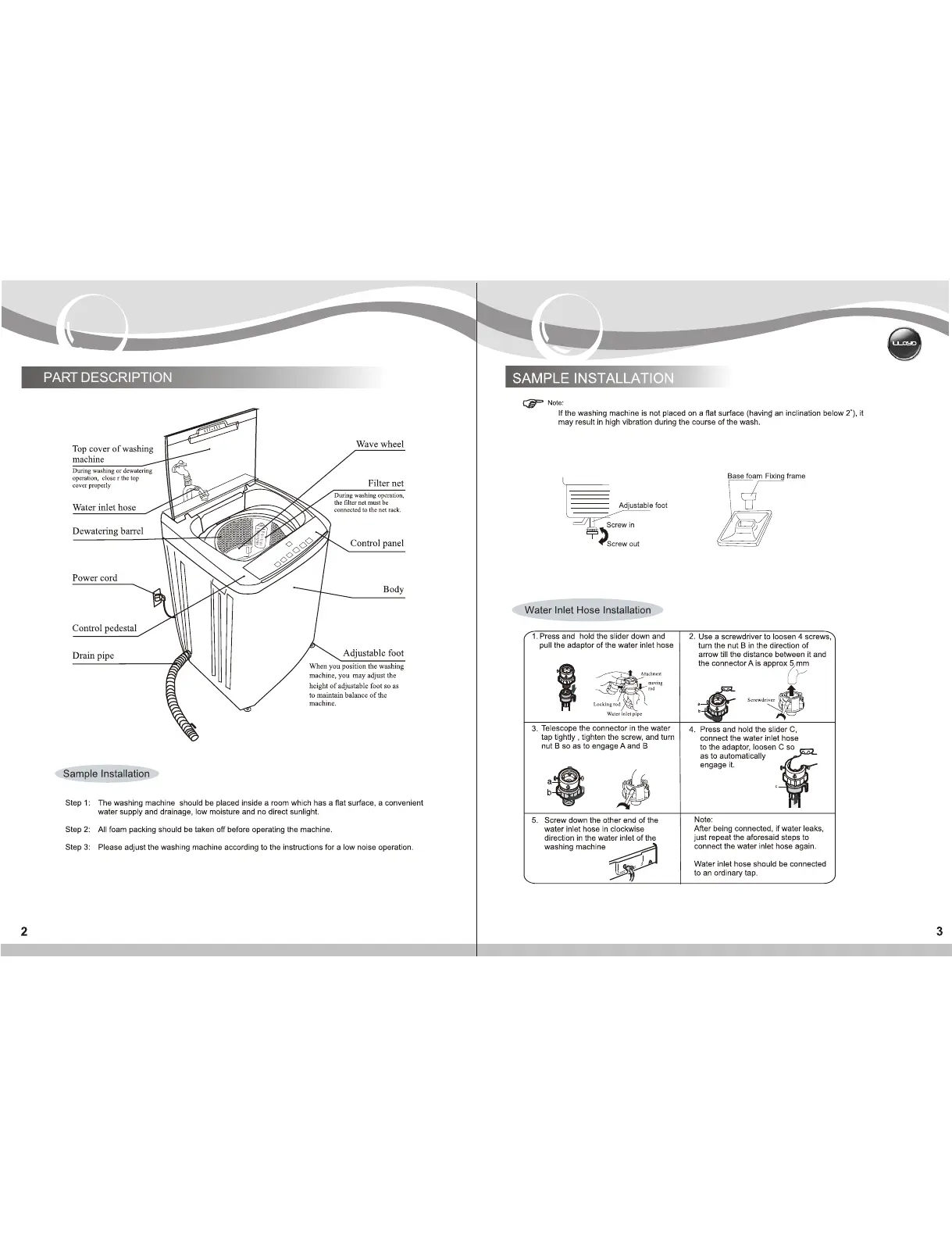 Lloyd LWMT65TG - Part Description and Installation; Component Identification; Water Inlet Hose Installation; Sample Installation Steps