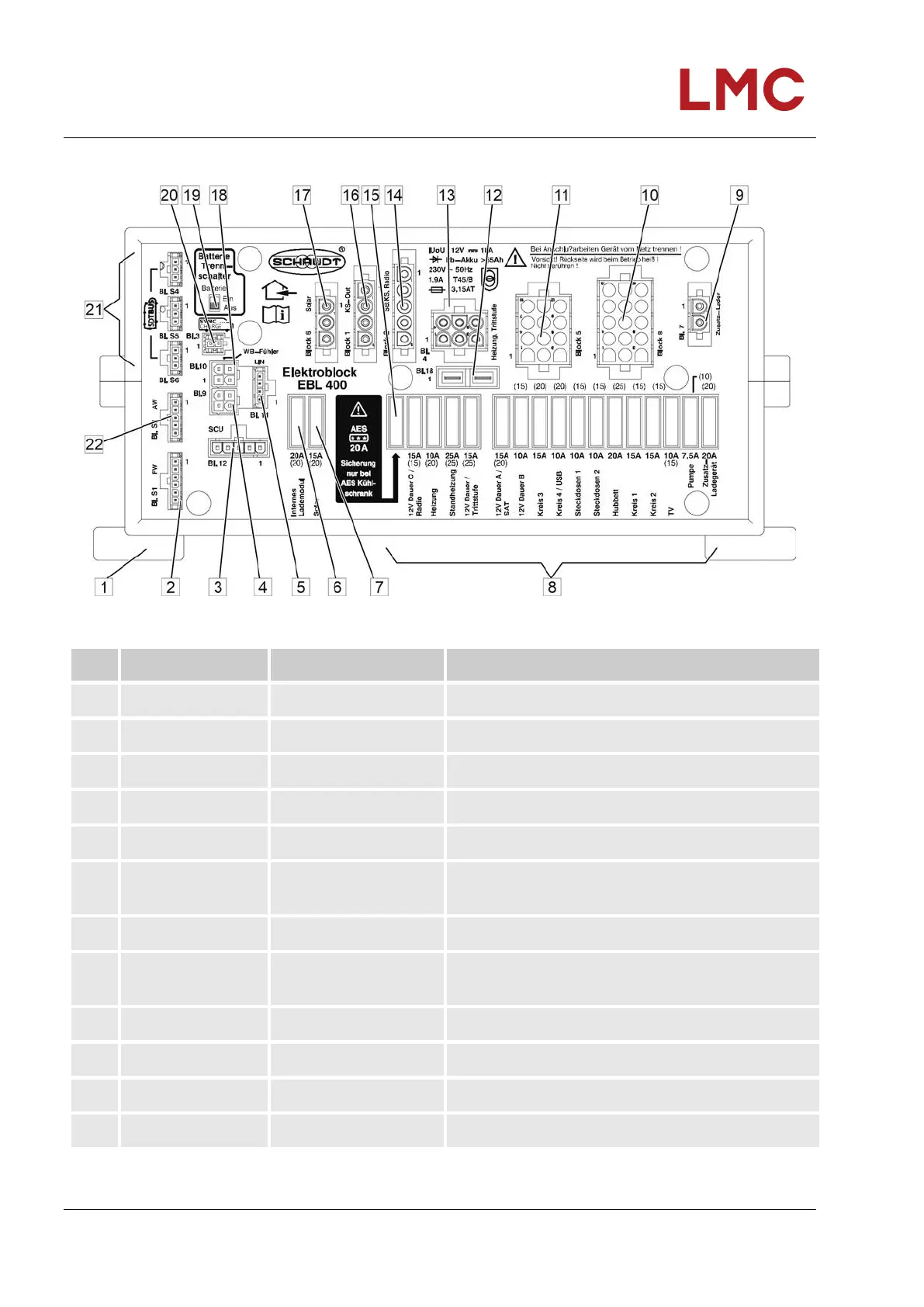 Fig. 6: Layout of the fuse plug-ins on the EBL 400 A (front)