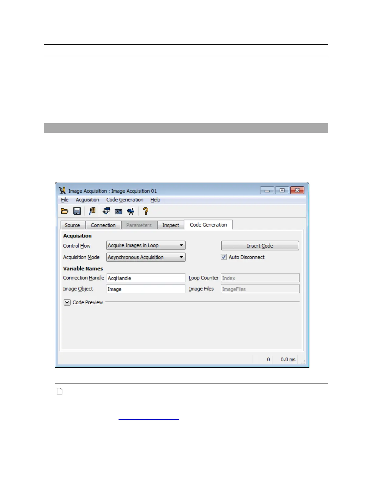 3. Under Acquisition, click Insert Code to generate the code that will open the acquisition device.