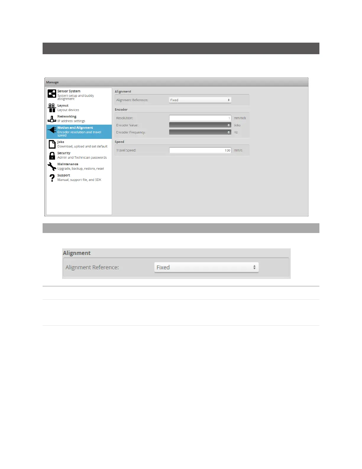 The Motion and Alignment category on the Manage page lets you configure alignment reference,