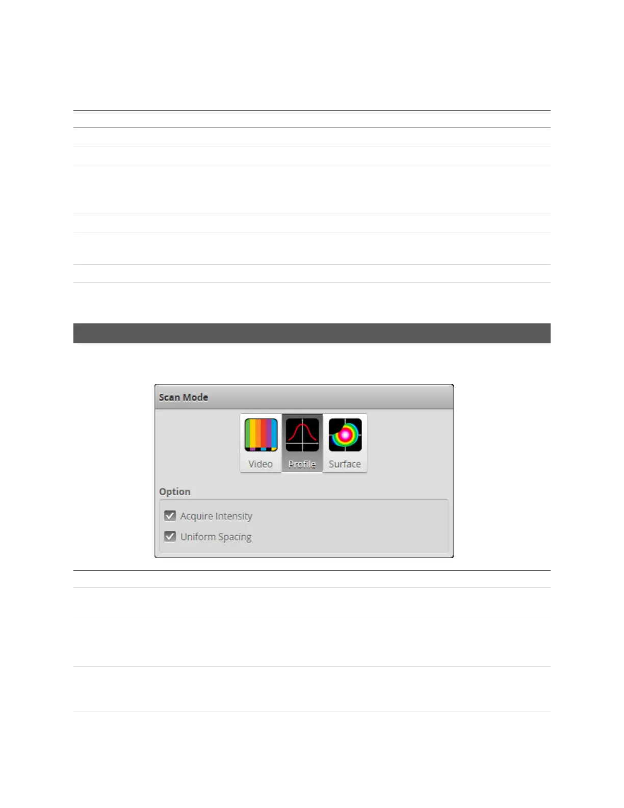 The Gocator web interface supports a video mode and one or more data acquisition modes. The scan