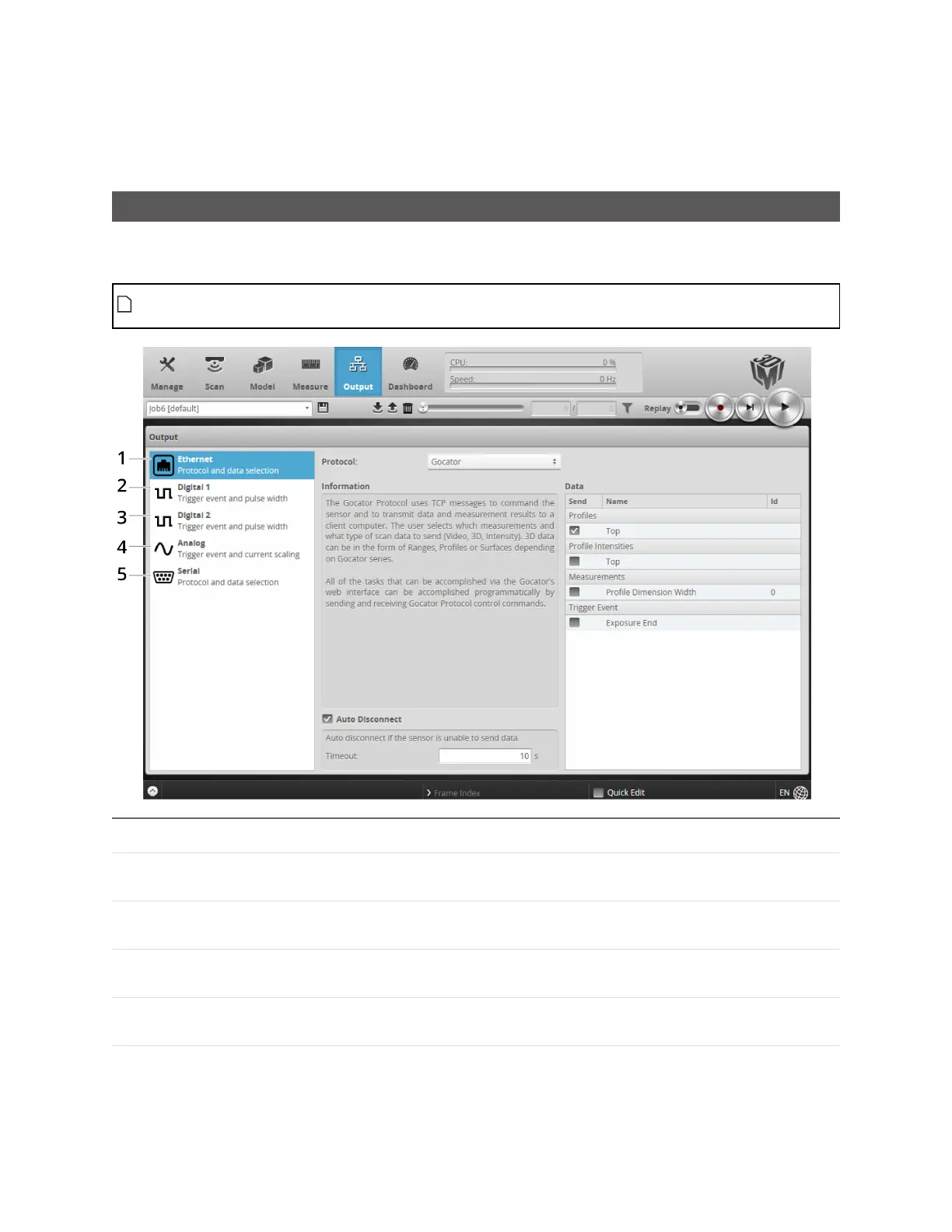 Output configuration tasks are performed using the Output page. Gocator sensors can transmit laser