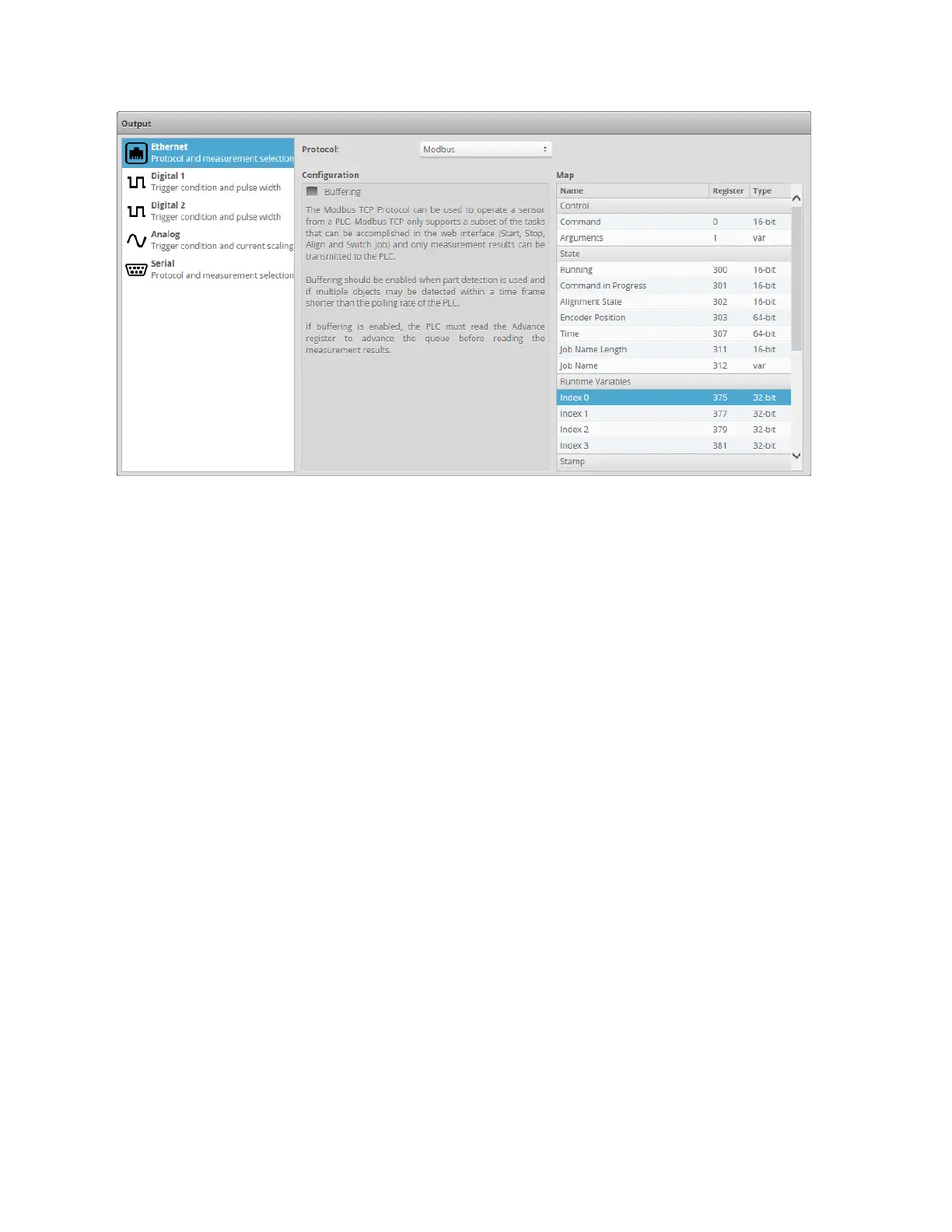 If buffering is enabled with the Modbus protocol, the PLC must read the Advance register to advance
