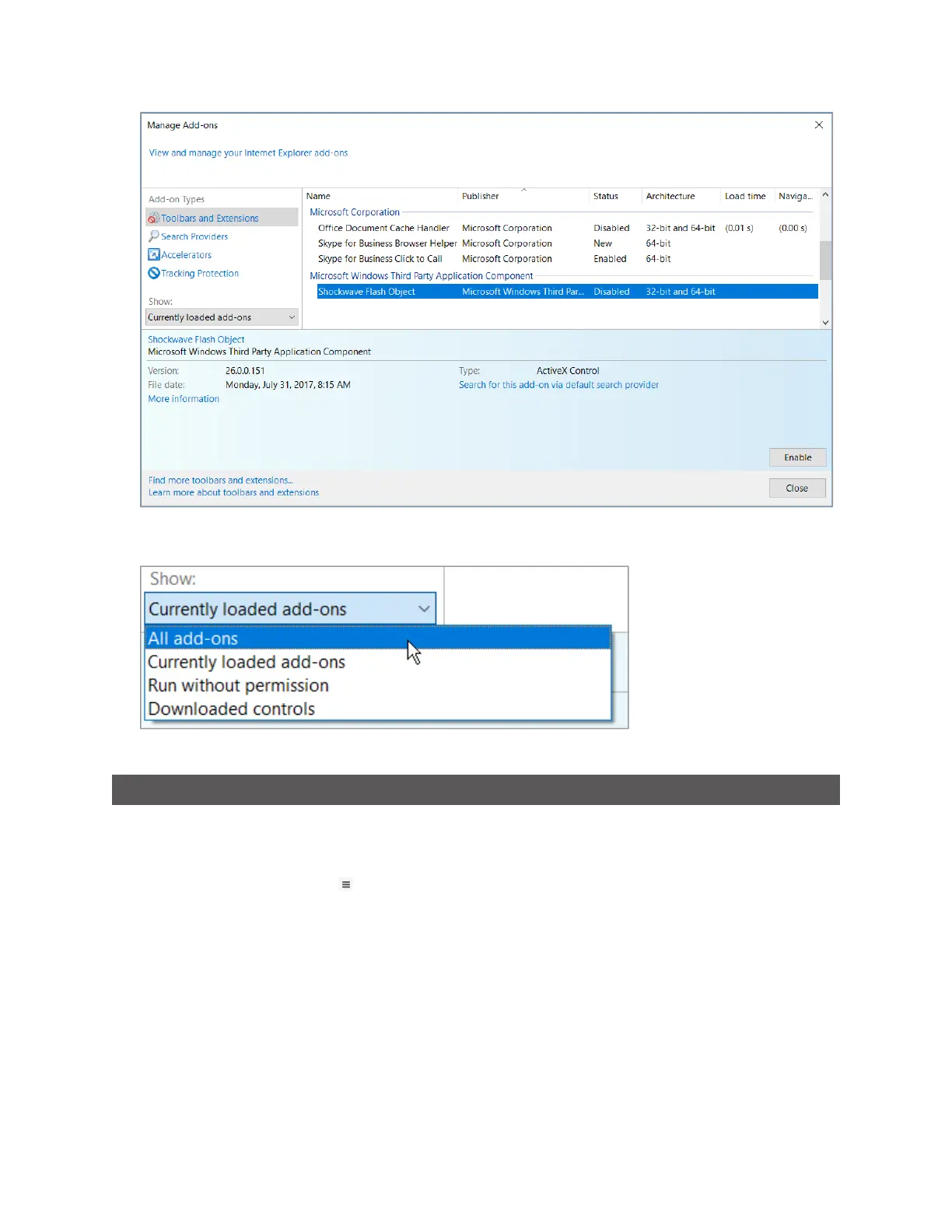 If you don't see Shockwave Flash Object in the list, you may need to choose All add-onsin the Show drop-