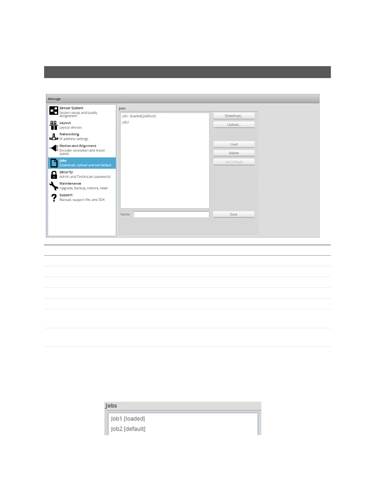 Jobs list Displays the jobs that are currently saved in the sensor's flash storage.
