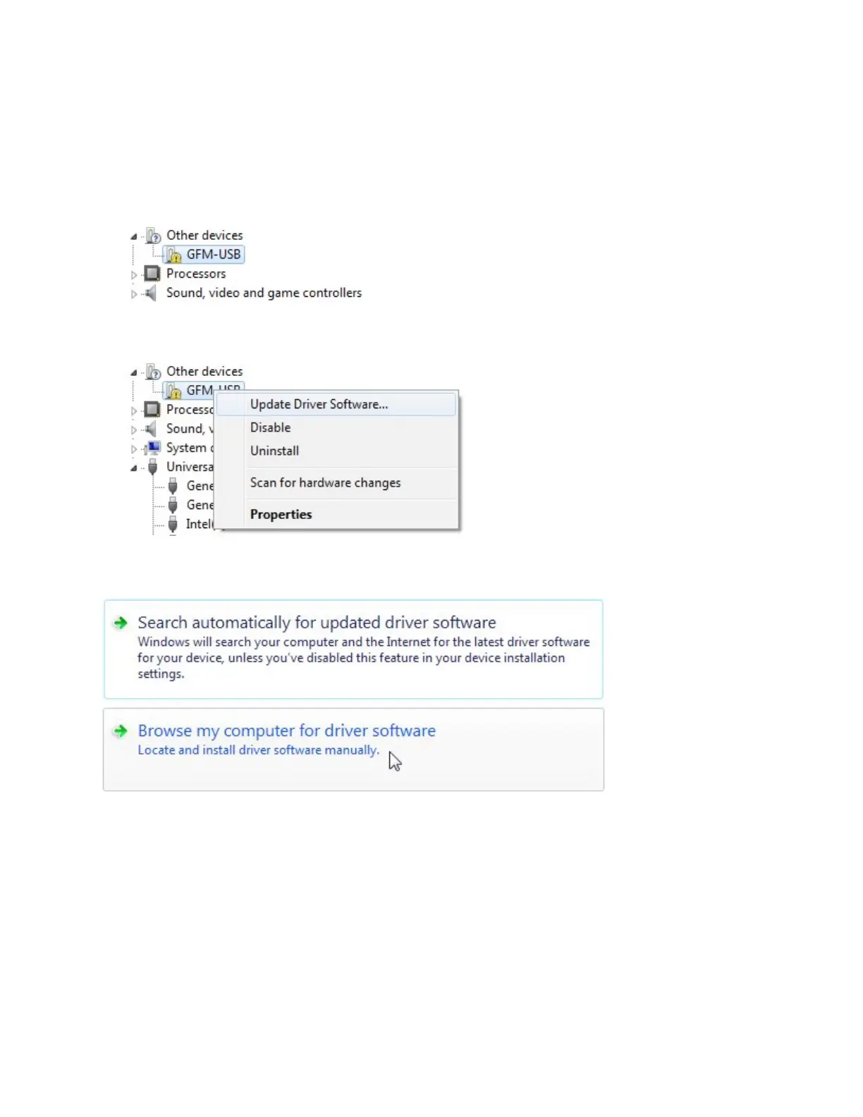 2. In the Device Manager, find the GFM-USB device under Other Devices.