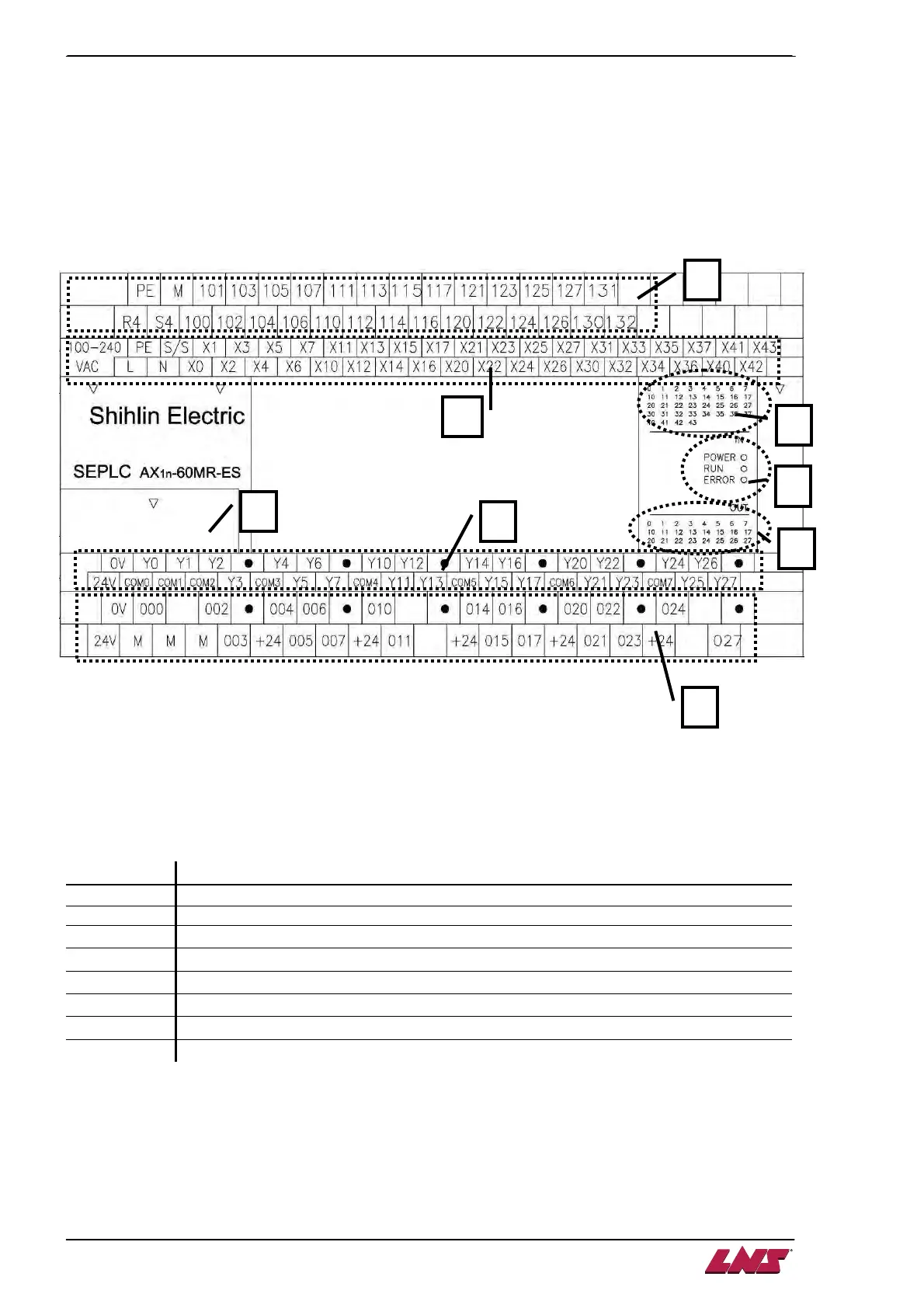 Output signals indication LED. Indicate the status of outputs Y0 to Y27