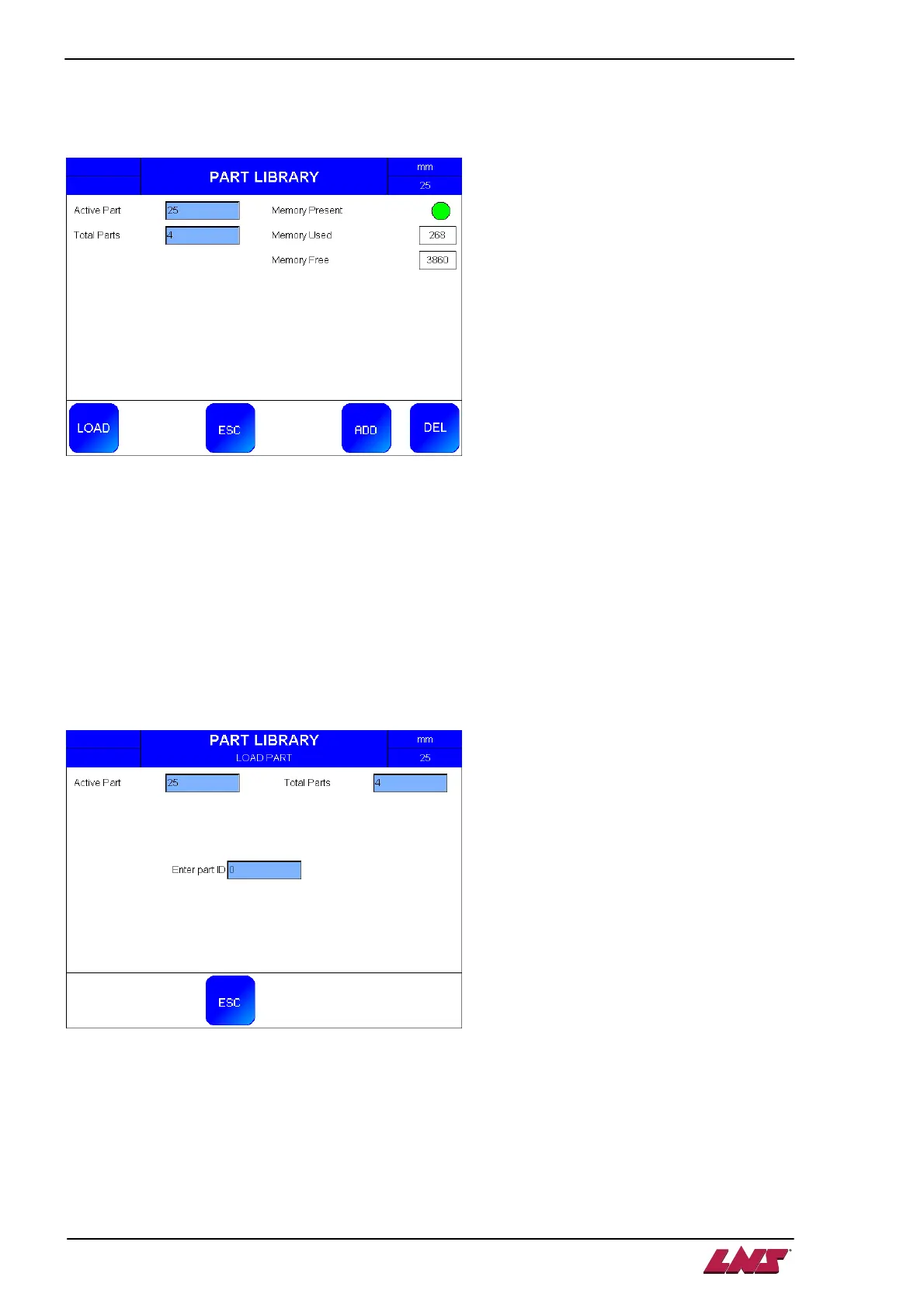 This screen allows recalling and loading the parameters of an existing part from the parts library into the