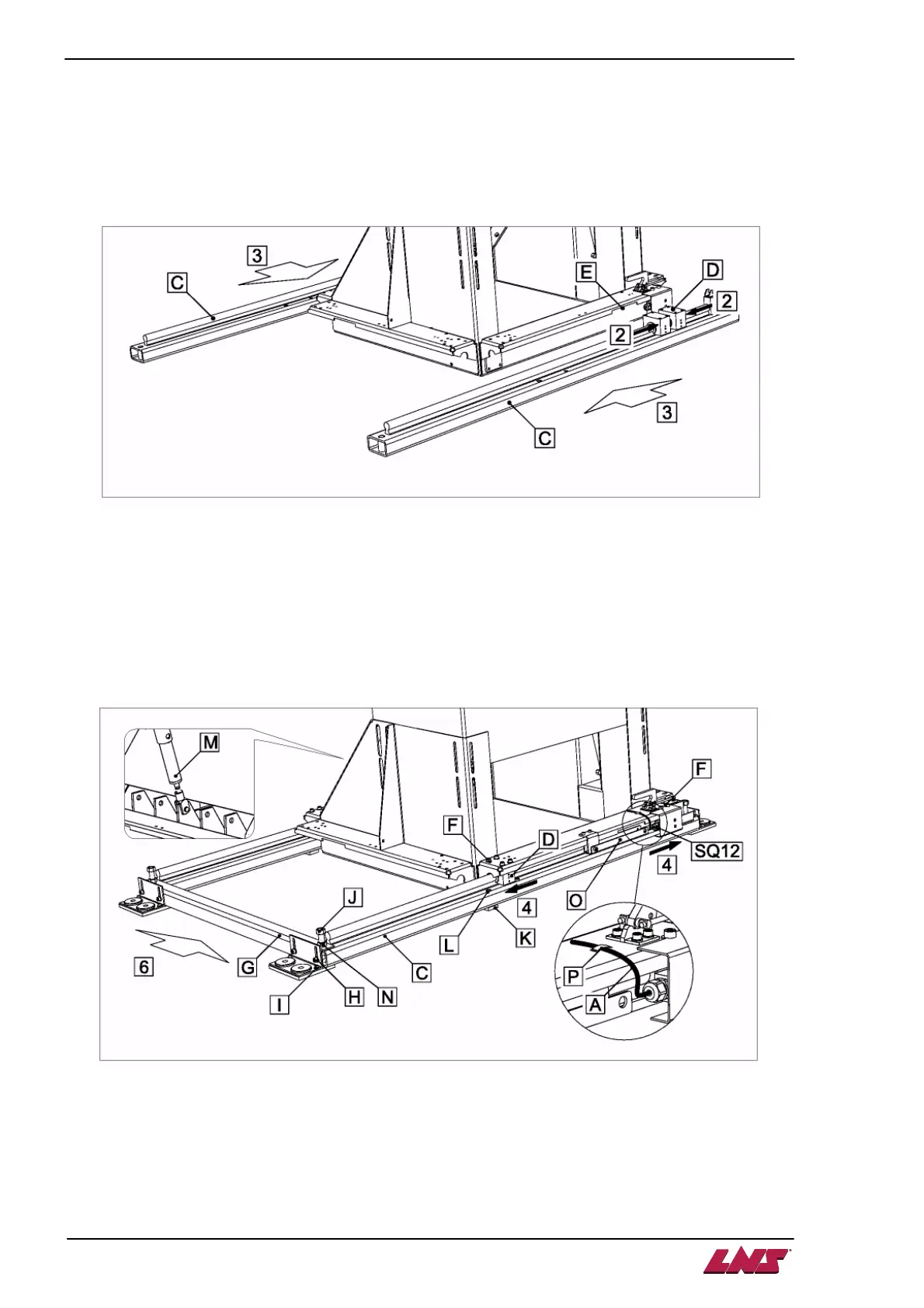 8. Install the four levelling screws (J) to guarantee the parallel of the rails.